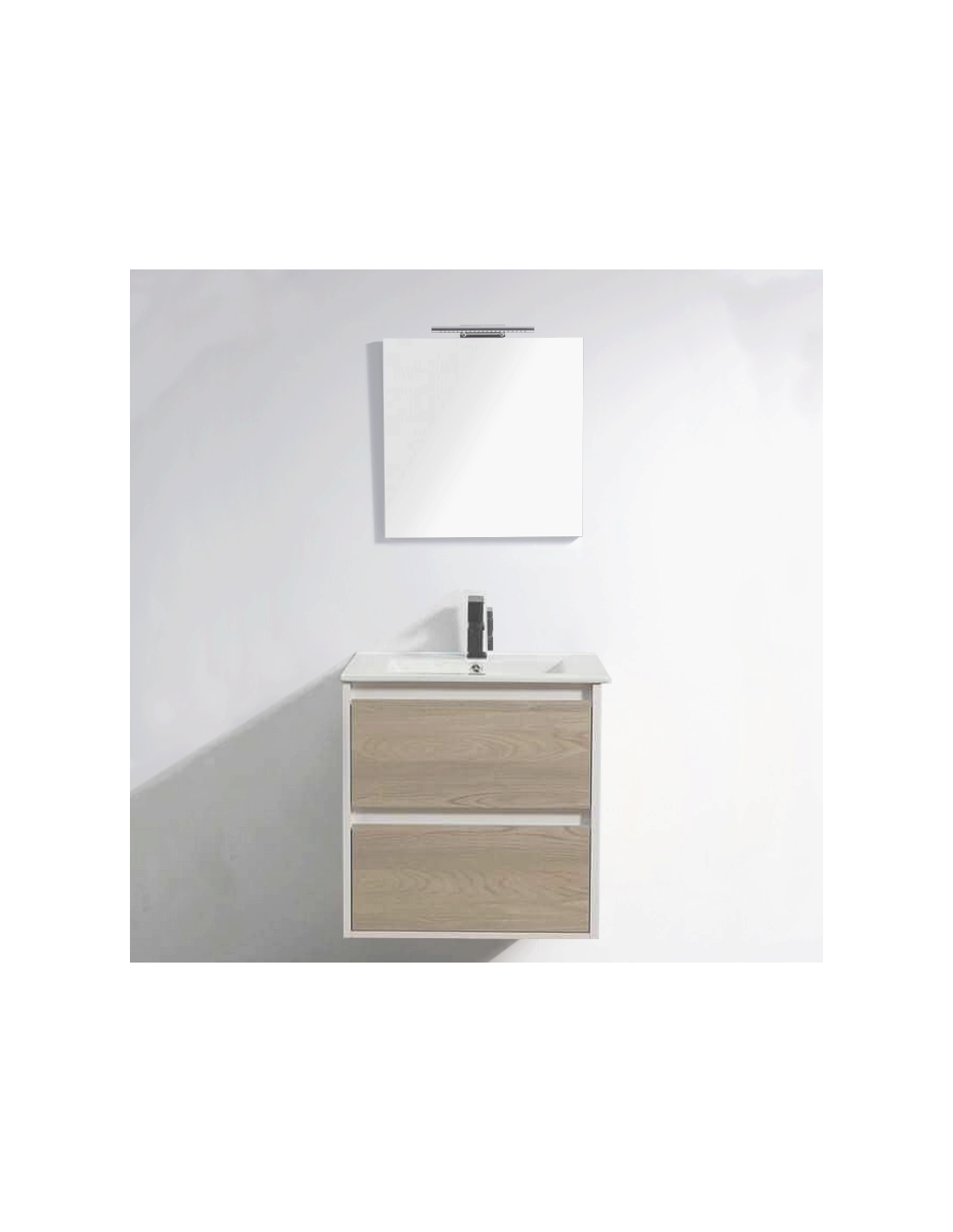 Der skandinavische 60 cm graue Eichen hängende Badezimmerschrank mit eingelassenem Becken in glänzender weißer Keramik ist mit zwei Schubladen ausgestattet. Die obere Schublade ist geschnitten, um den Durchgang zum Siphon zu verlassen, die untere Schublade ist voll.