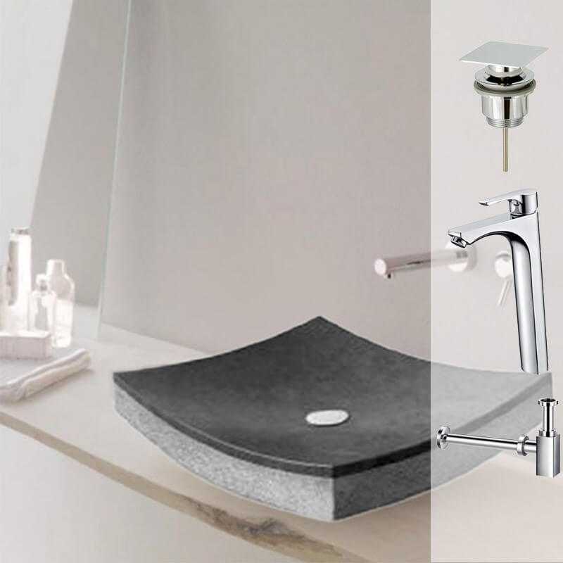 Dieses originelle und raffinierte schwarze Steinverlegebecken bringt Eleganz und Einzigartigkeit zu Ihrem Design-Badezimmer. Seine Farbe wird mit allen Dekorationen heiraten und eine weitere Perspektive zu Ihrem Bad Raum geben. Der verchromte Messing Quadrat clapp wird das Innere Ihres Beckens hervorheben, ergänzt durch den hochverzinkten Hahnenmischer und den verchromten Messing quadratischen Totem siphon, werden Sie stolz sein, dieses Set zu besitzen.