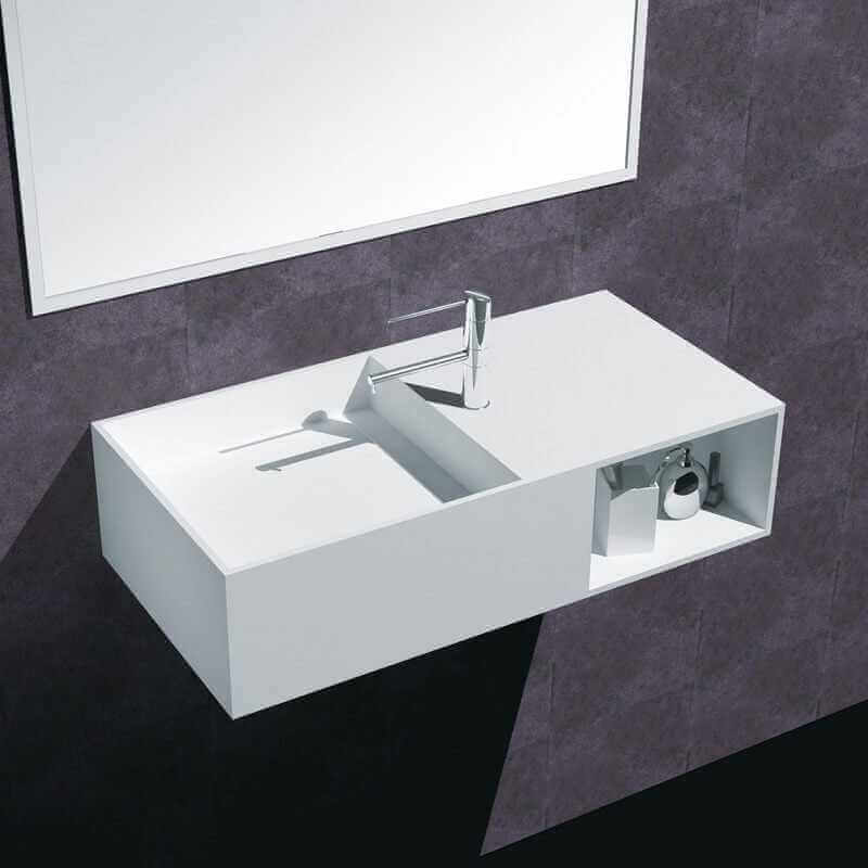 Let yourself be seduced by the Washbasin Composite solid surface with storage space. The hand washer is rectangular in shape. Its contemporary design will bring a genuine seal to your design bathroom.