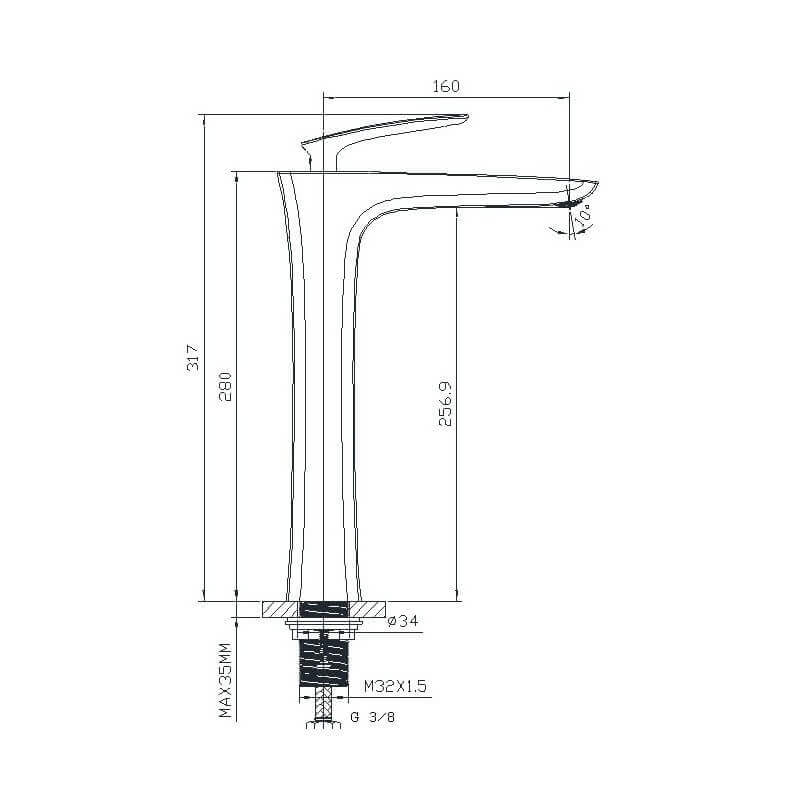 Lavabo Mitigeur ideal with high basins to mount with a click-clac. Foam removal key provided.