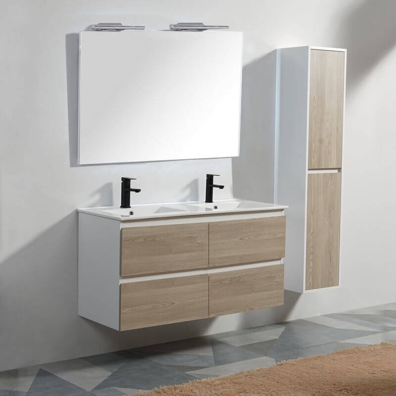 Choose the double hanging bathroom cabinet Scandinavia basin 120 cm and the Classic 120 rectangular mirror with two led lamps. With this pack you will receive a 10% discount. With its 4 drawers, equipped with "soft-close" cushioned closures, this double-basin cabinet offers a large storage capacity. The Classic 120 mirror with its 2 LED lamps will complete this set.