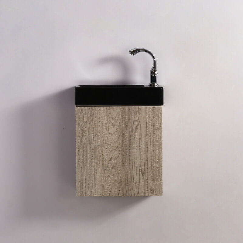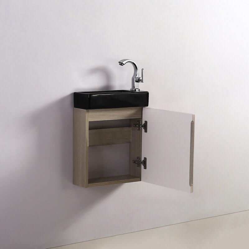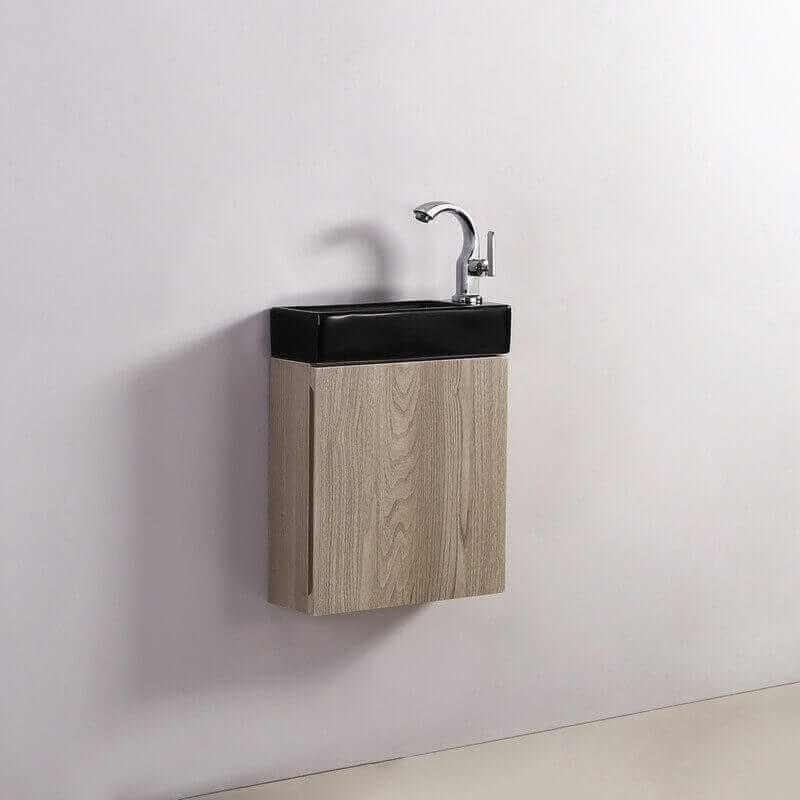 Enjoy 10% savings with the purchase of the Handwashed Minimalist BLACK with taps on the left and the Hand wash cabinet Oak Grey to fit your toilet. Storage cabinet with door. Hand wash in black ceramic. Guarantee 2 years.