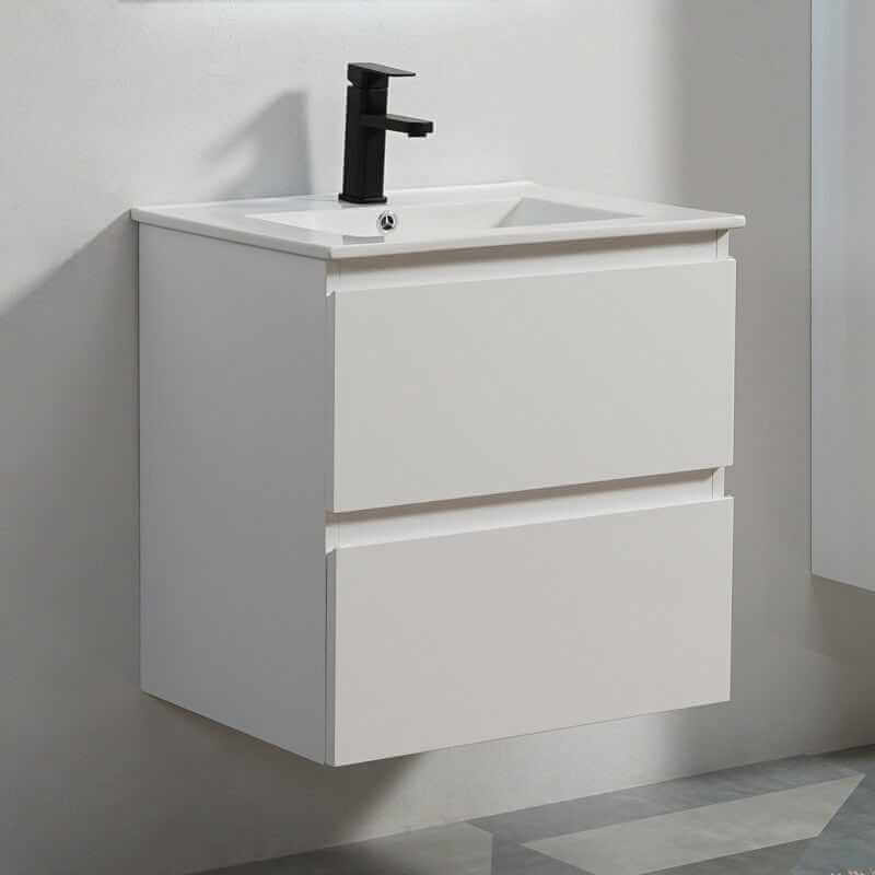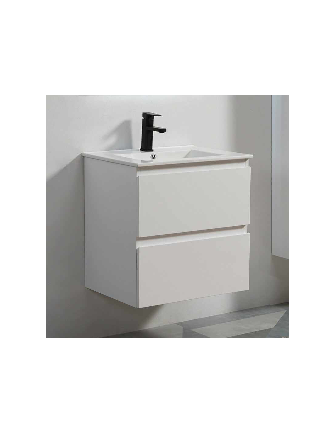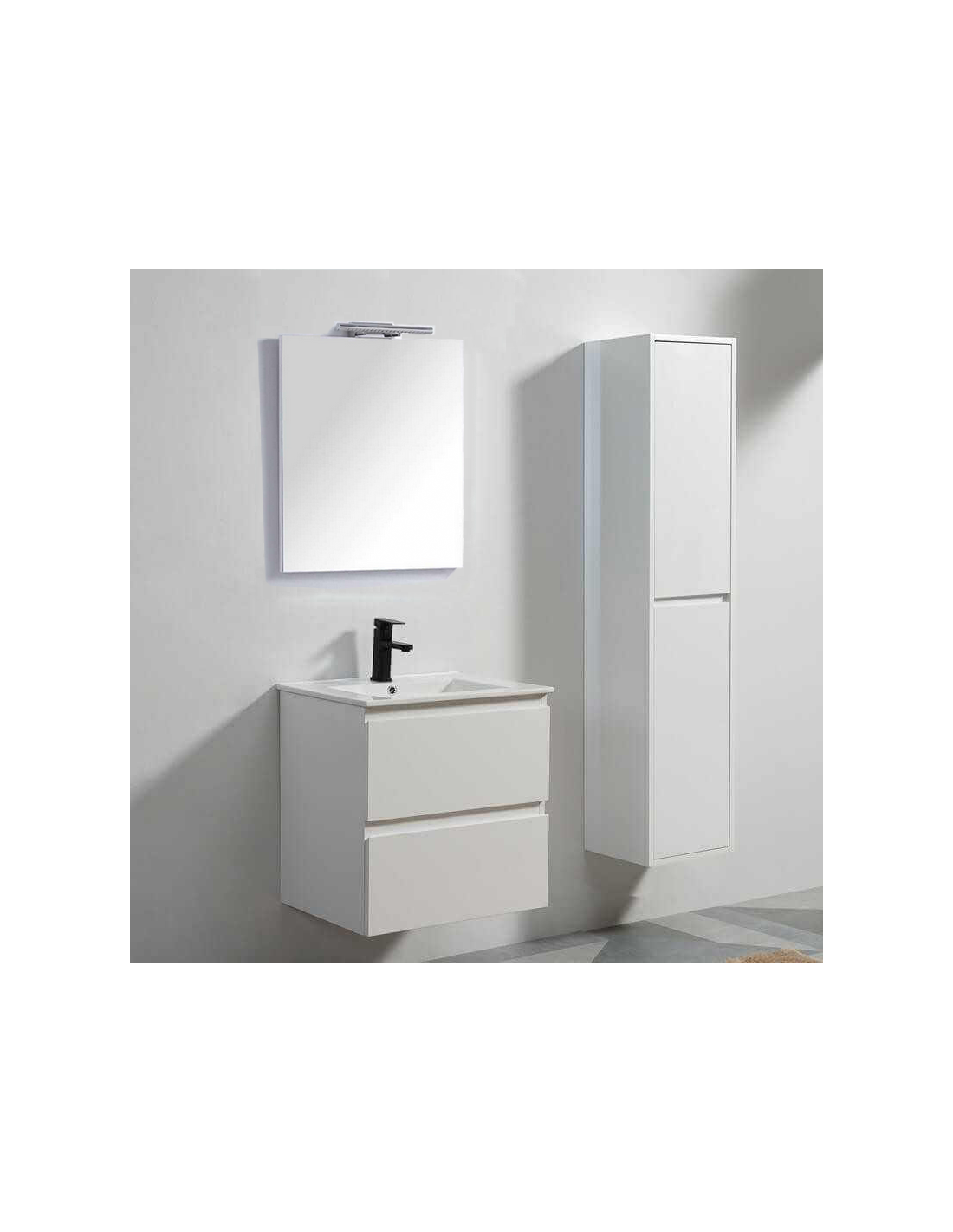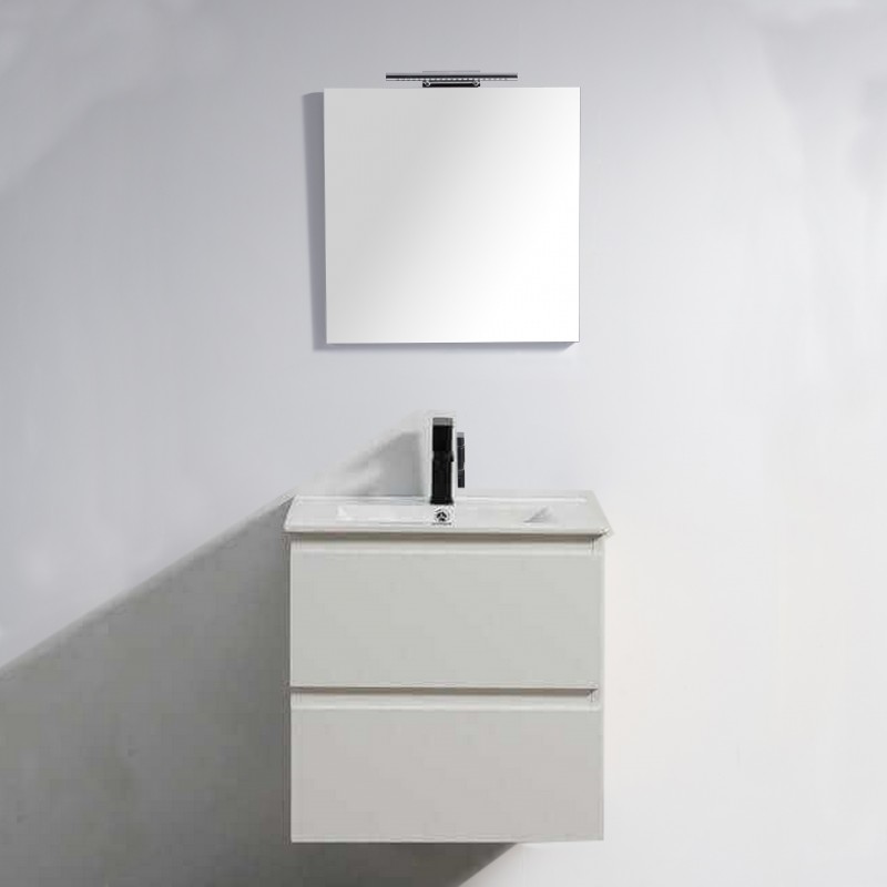 Choose single bathroom furniture hanging basin City 60 cm with a low cabinet with two drawers, a recessed white ceramic sink and a mirror 60x80 cm with LED lamp applied to the mirror.
