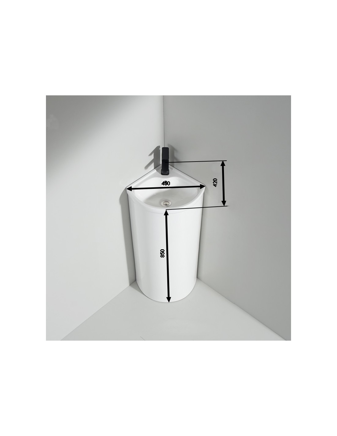 The Washbasin in shiny white ceramic is to be laid at the corner of a wall, it is pierced on the sides for evacuation Hot Water / Cold water