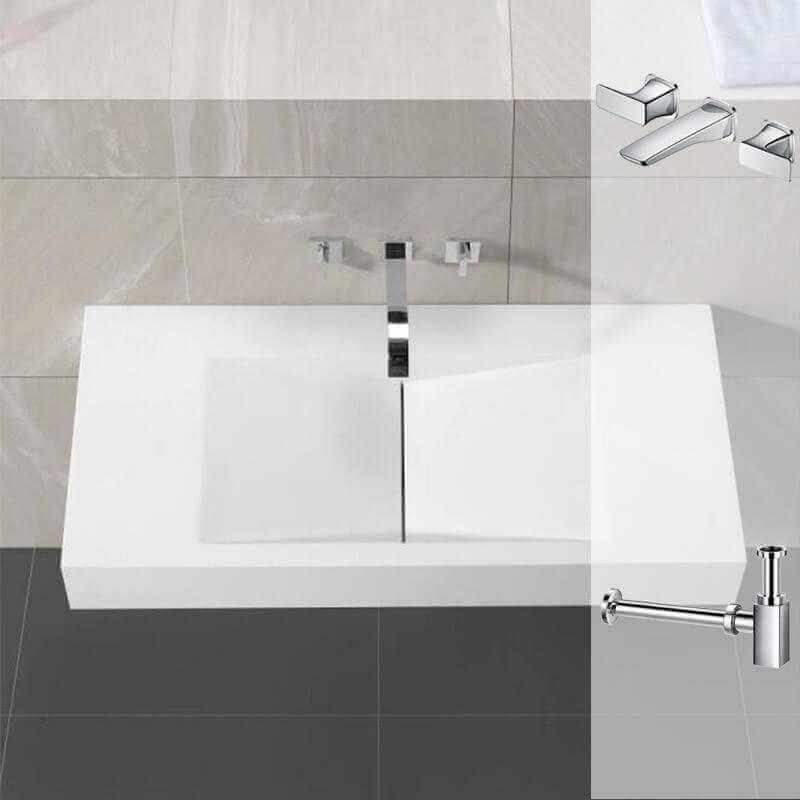 This set consists of a suspended sink made of matt white coral composite with contemporary lines. The sink is associated with its chromed wall sink mixer tap and its chromed brass square totem siphon.