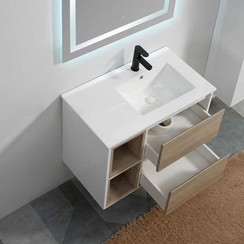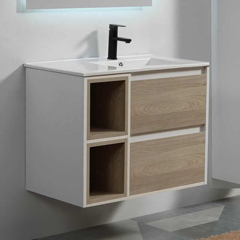 Mueble de baño con simple lavabo de cerámica blanca 80 cm + 2 nichos. Regreso del cliente, embalaje reenvasado. Artículo garantizado 2 años (nueve). Embalaje reacondicionado.