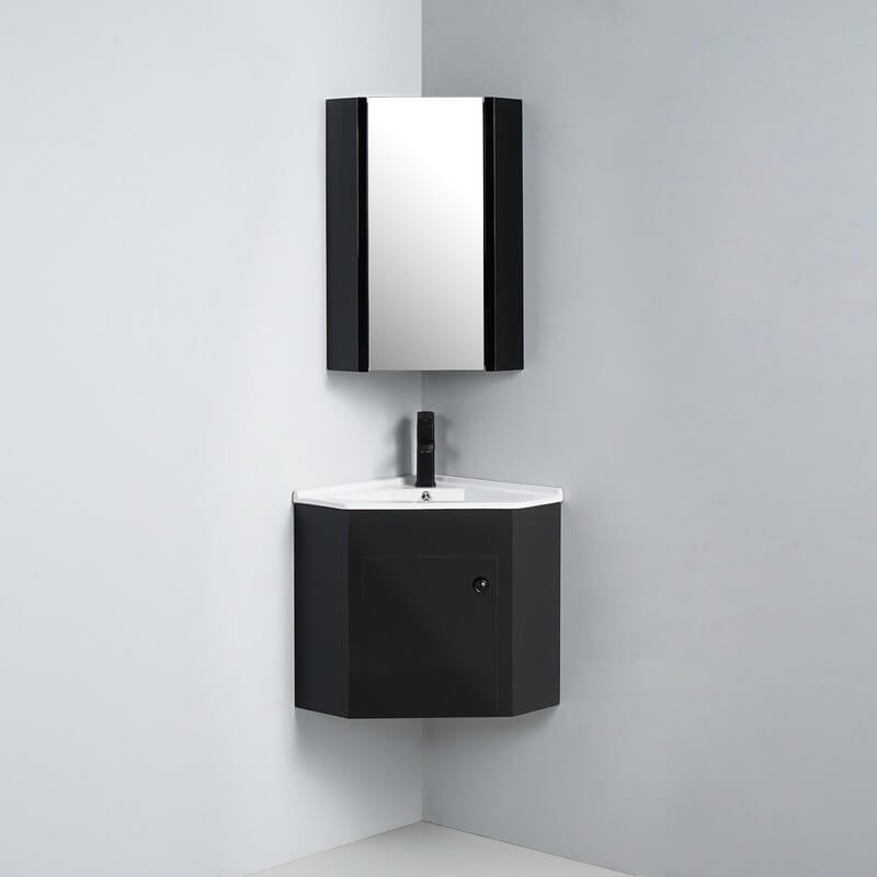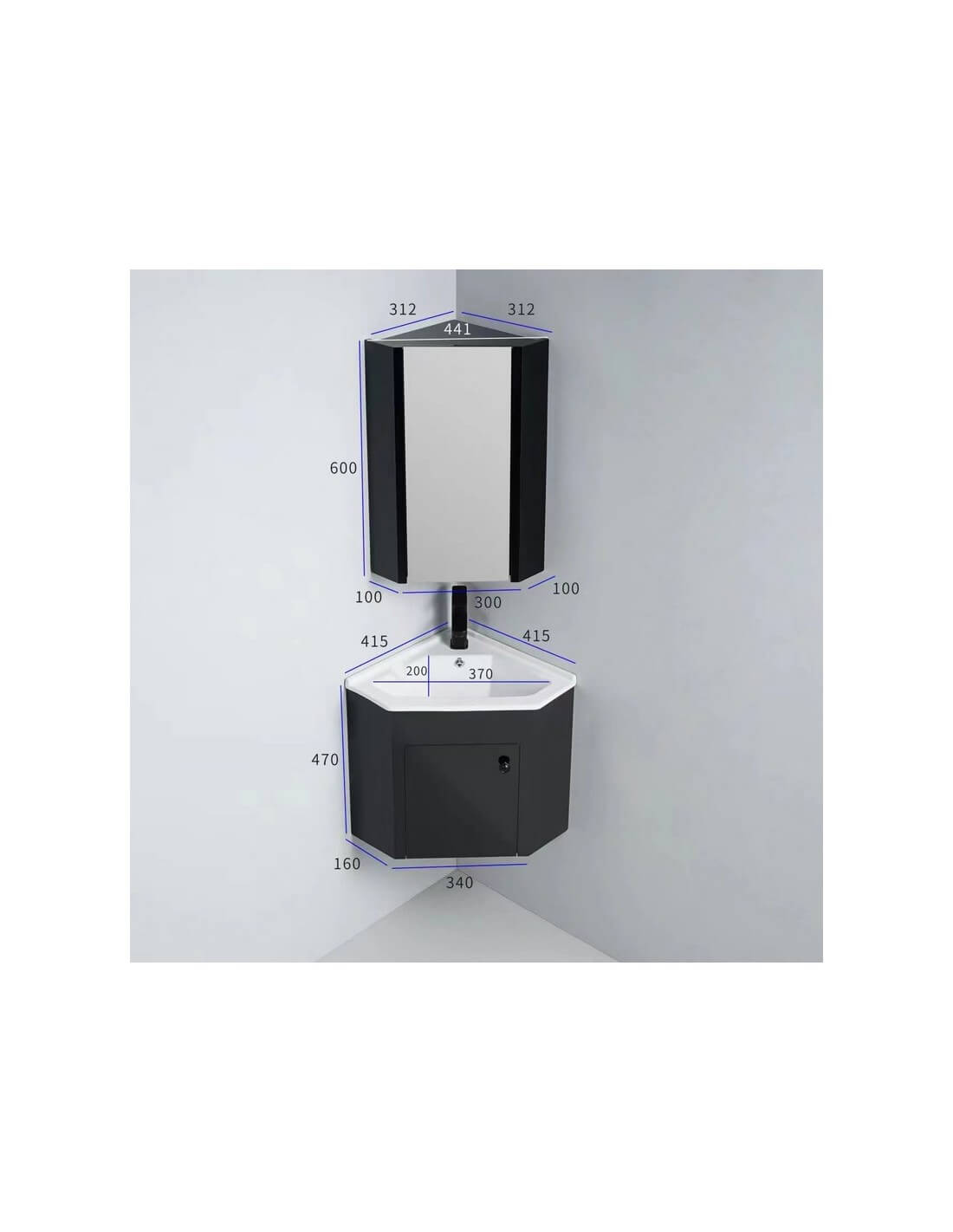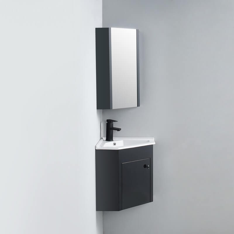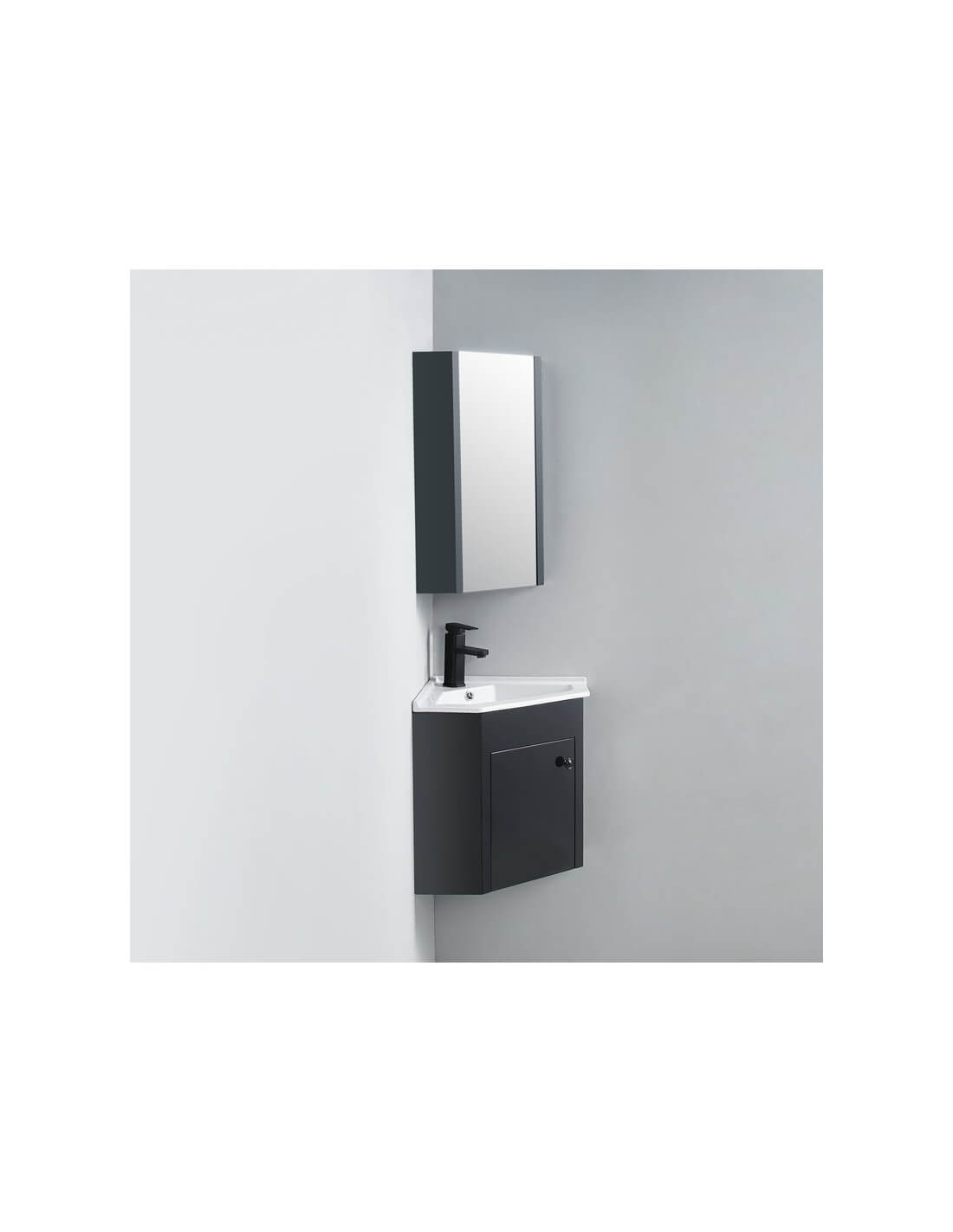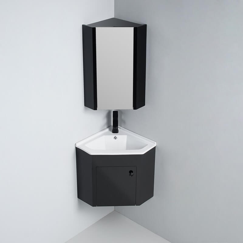 El armario espejo de esquina para lavar las manos tiene un espacio de almacenamiento con un estante y una puerta de espejo.