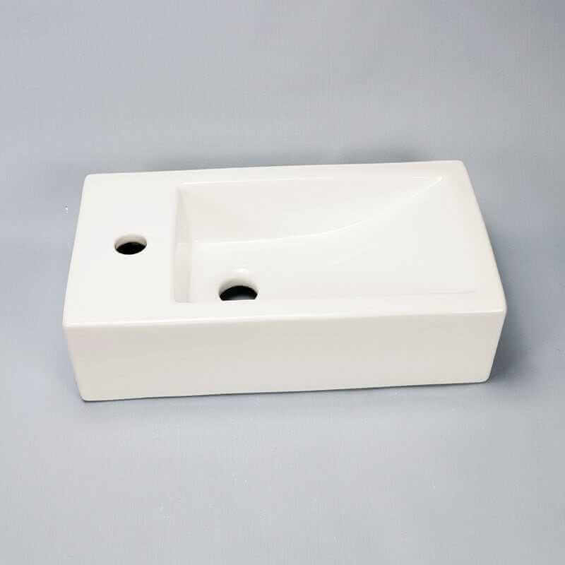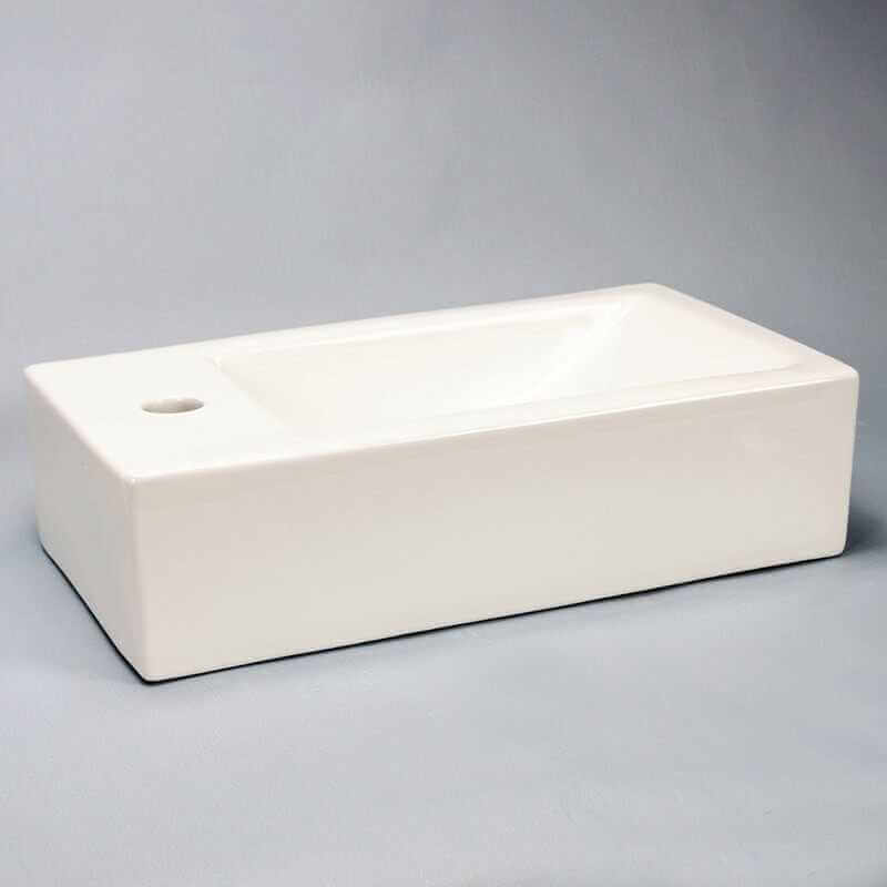 El estudio principal de Lava, encajará fácilmente en pequeños espacios. Esto Lavado de mano rectangular cerámica blanca tiene una línea de grifos a la izquierda donde se puede instalar fácilmente un grifo cromo.