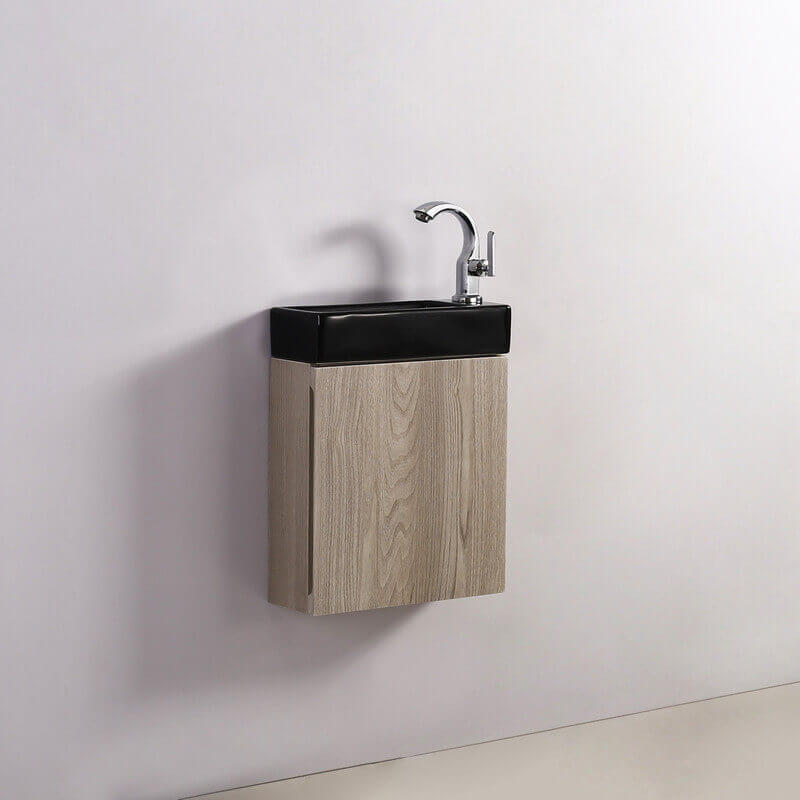 Muy práctico, los muebles colgantes se instalan bajo un pequeño lavar las manos de un tamaño de 38X14 cm, como nuestra mano de lavado ganar espacio Minimalista (NON incluido). Este lavado de mano de cerámica está disponible en blanco o negro, y con grifos en la derecha o la izquierda, dependiendo de su deseo.
