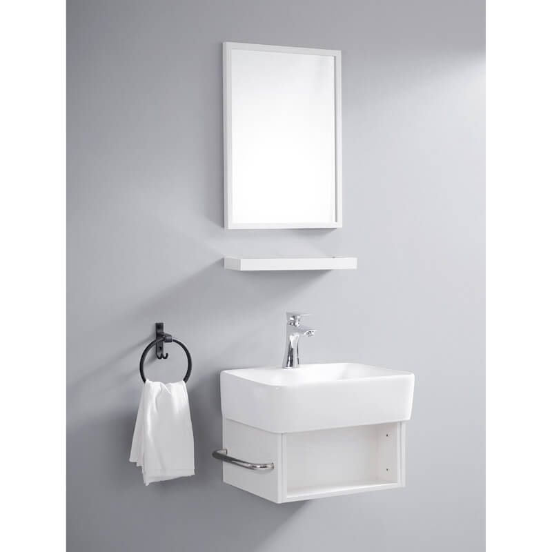 Este sencillo conjunto de baño le permitirá desarrollar un pequeño baño de forma práctica y optimizar el espacio con un mobiliario colgante.
