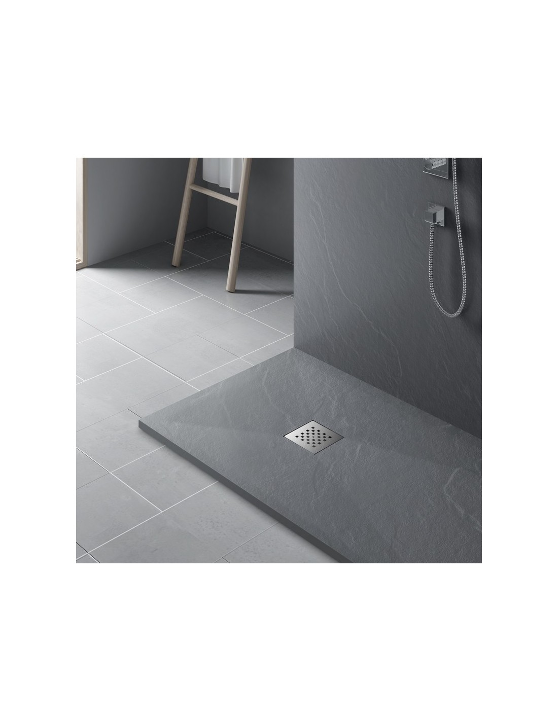 Una rejilla cuadrada de acero inoxidable extraíble completa este receptor plano extra. Viene con un sistema de drenaje de 90 mm de diámetro.