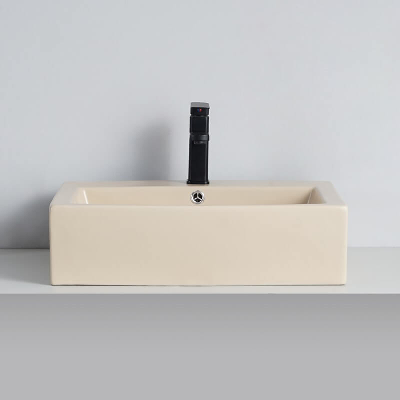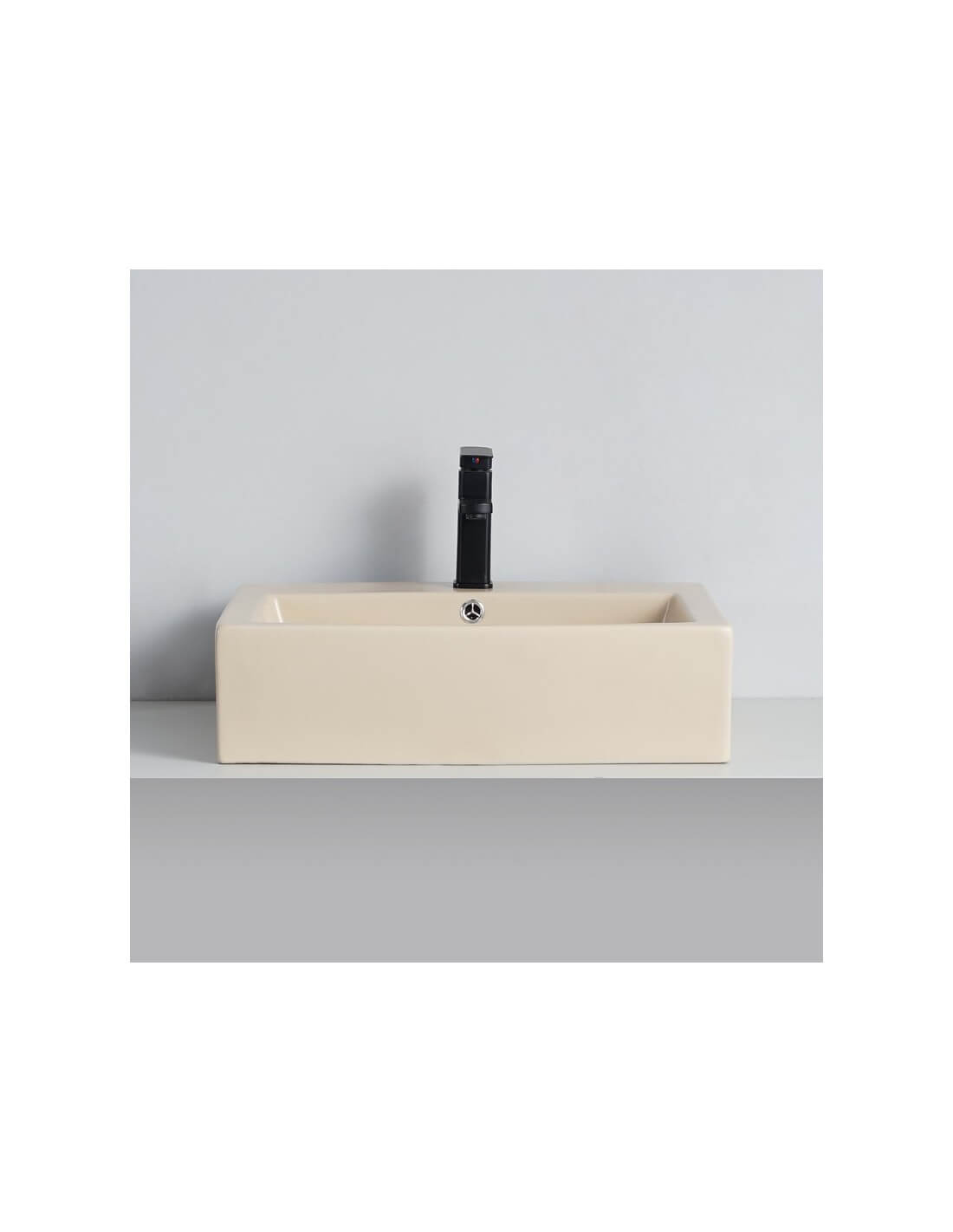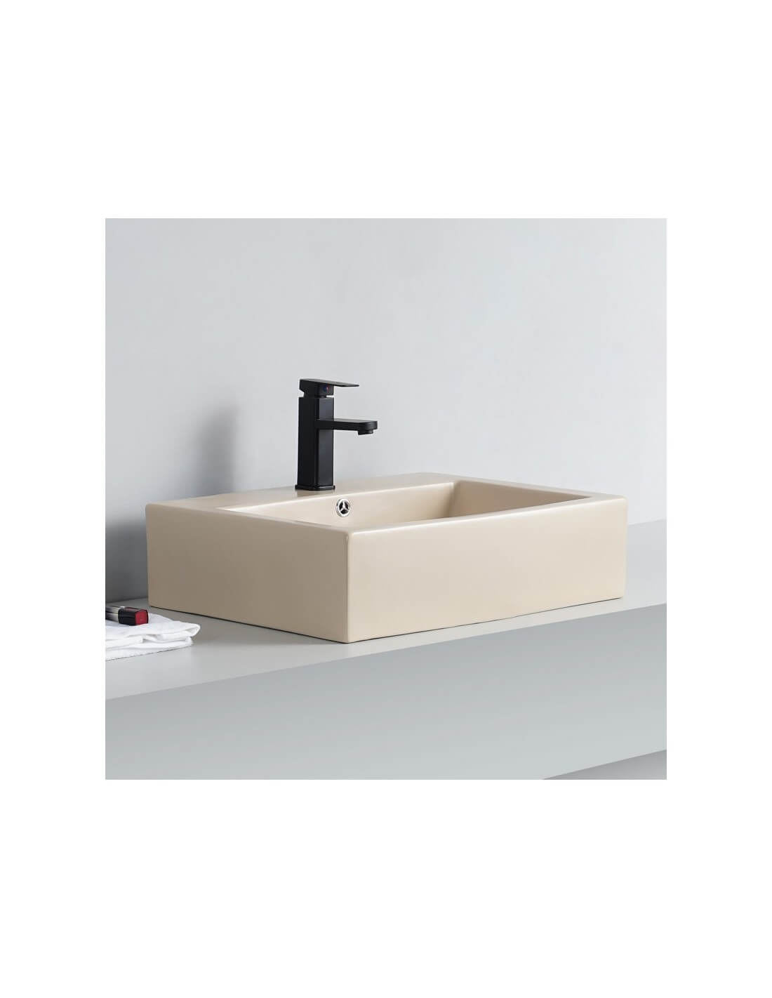 Esto cuenca de construcción de cerámica latte rectangular mate se instala con un grifo de cromo bajo. El demasiado lleno con cubierta de cromo está equipado permite evitar desbordamientos. Puedes usar un grifo de lavabo de cromo para más acabado.