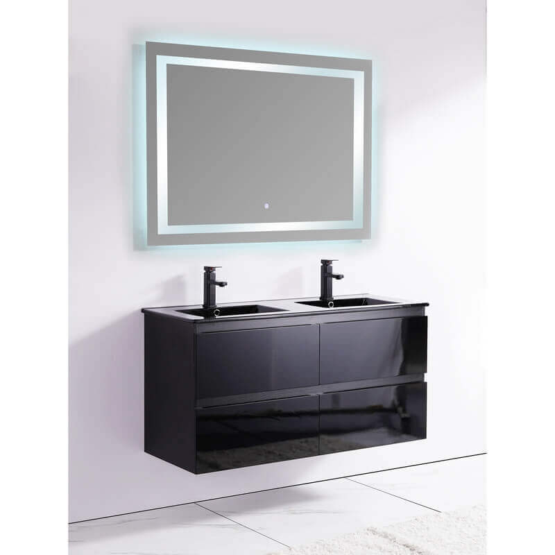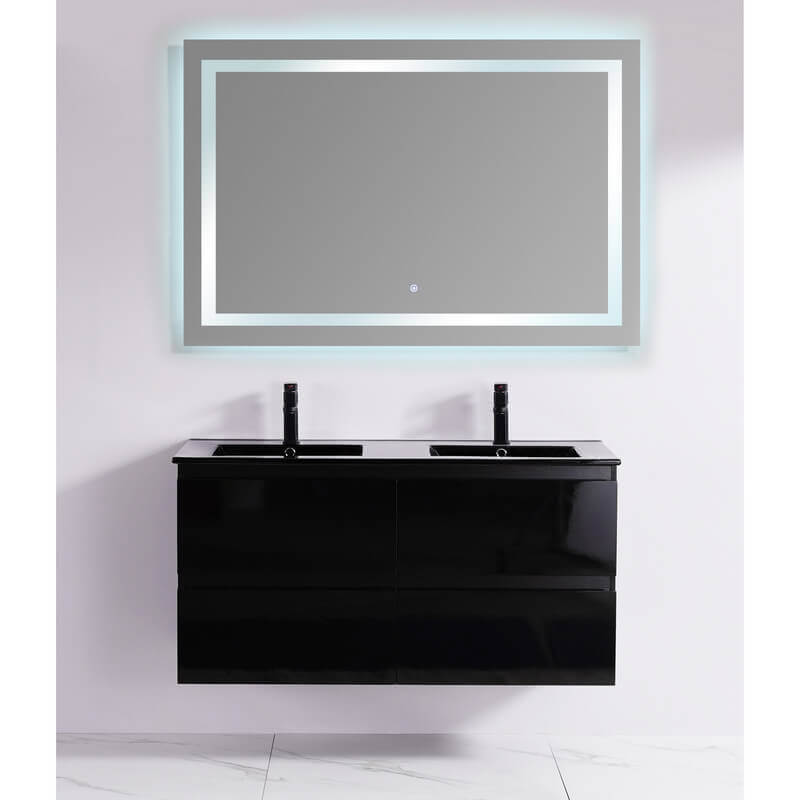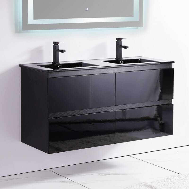 Crack per questo mobili bagno doppio lavandino 19 mm nero MDF lucido nero, con due grandi bacini in ceramica nera lucida e quattro cassetti. I suoi 4 cassetti vi permetteranno di memorizzare tutti i vostri effetti personali. Il sistema "soft close" consente di chiudere i cassetti lentamente e quindi sicuri per le dita.