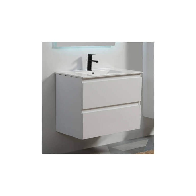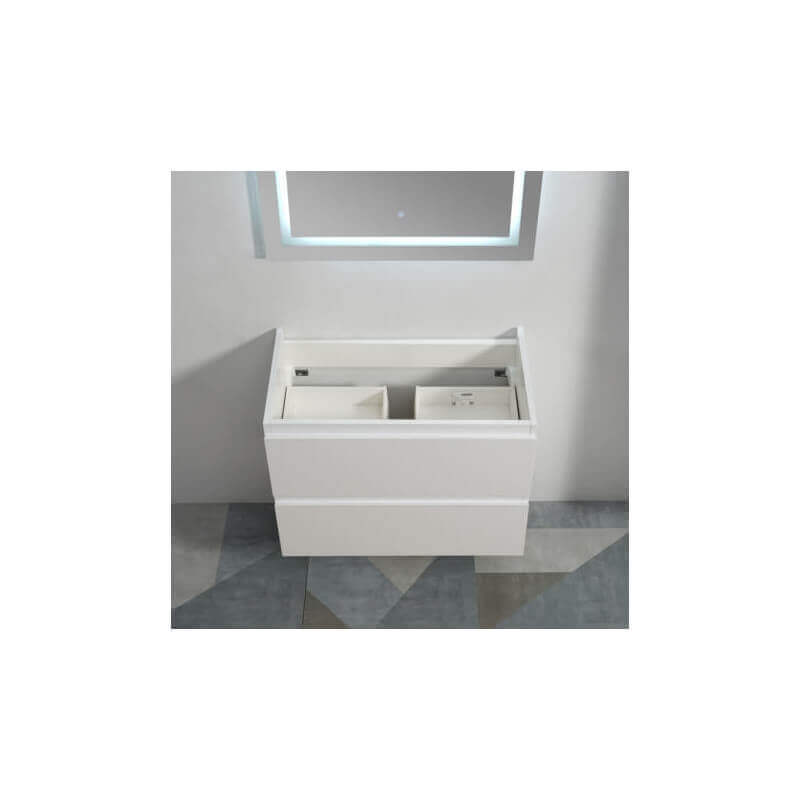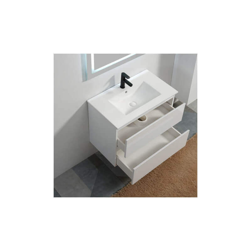 The Mobili da bagno città 90 cm sospensione bianca con lavello in ceramica bianca lucida è dotata di due cassetti ammortizzati chiusure morbide. Il cassetto superiore è abilmente tagliato per lasciare il passaggio al sifone, il cassetto inferiore è pieno.
