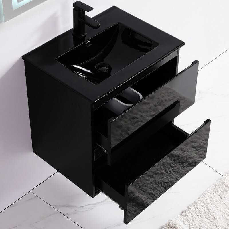 La vasca da incasso è realizzata in ceramica nera lucida ed è perfettamente adattata all'armadio.