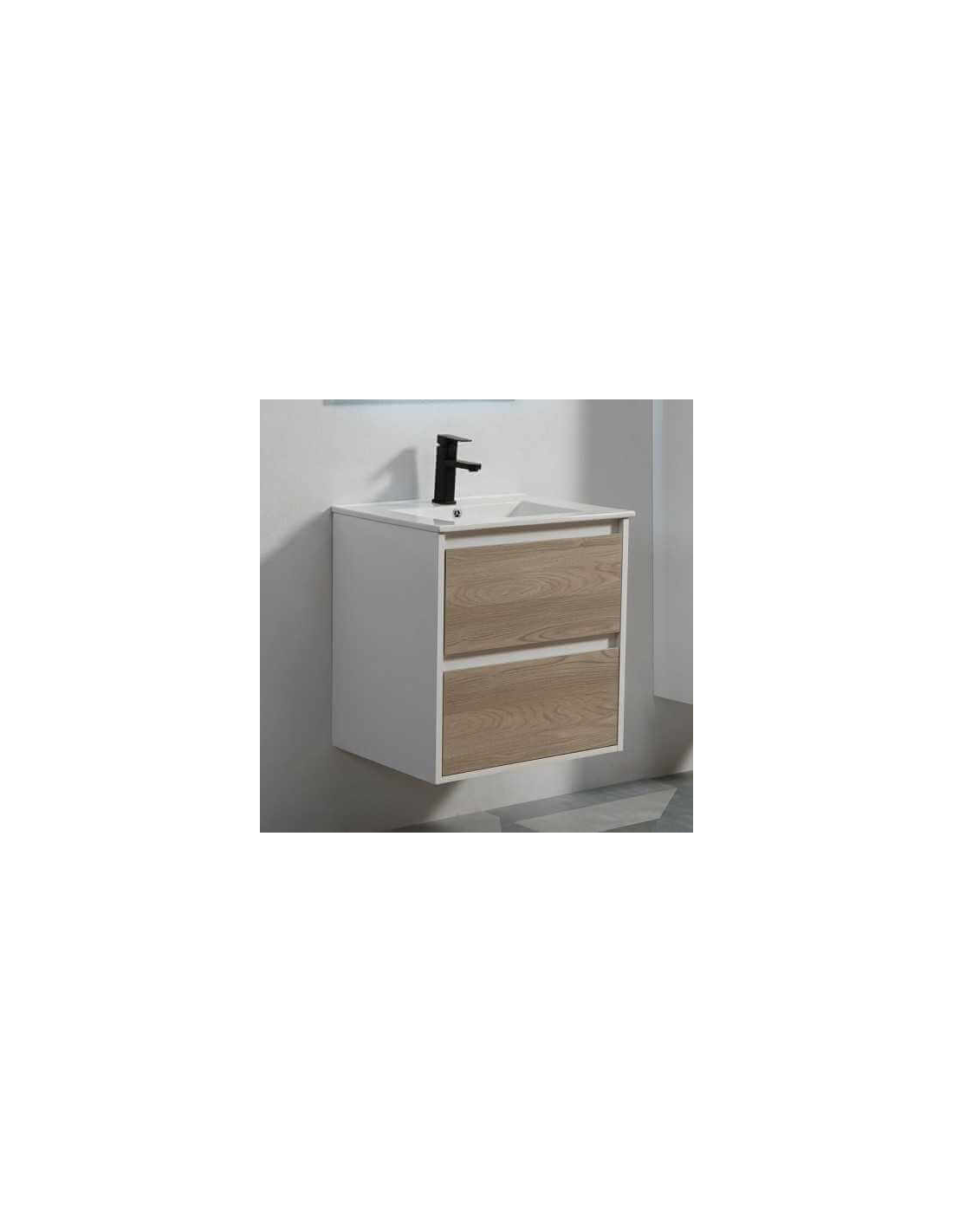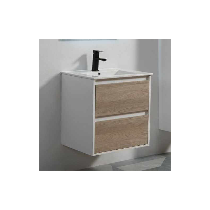 L'armadio da bagno in rovere grigio scandinavo da 60 cm con lavabo in ceramica bianca lucida è dotato di due cassetti. Il cassetto superiore è tagliato per lasciare il passaggio al sifone, il cassetto inferiore è pieno.