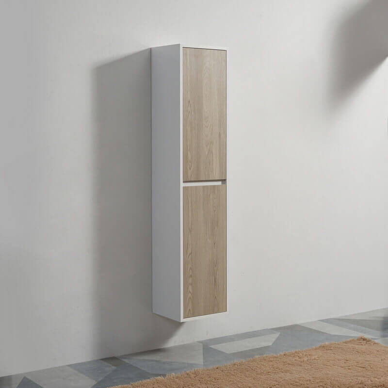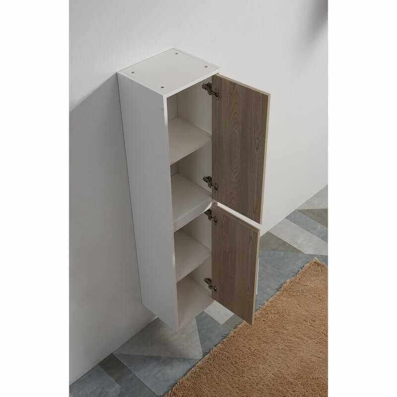 Cracking per la colonna di stoccaggio sospesa per bagno o camera da letto in MDF 19 mm laccato bianco lucido sui lati e colore legno sulle facciate delle 2 porte in MDF 19 mm. Il colore grigio rovere delle porte dà un lato contemporaneo e design al vostro bagno moderno.