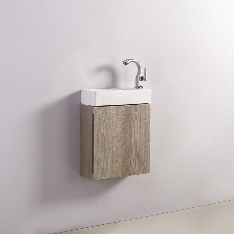 Molto pratico, l'arredamento appeso è installato sotto un piccolo lavare le mani di una dimensione di 38X14 cm, come il nostro lavaggio spazio mano guadagno Minimalist (NON incluso). Questo lavaggio a mano in ceramica è disponibile in bianco o nero, e con rubinetti a destra o a sinistra, a seconda del vostro desiderio.