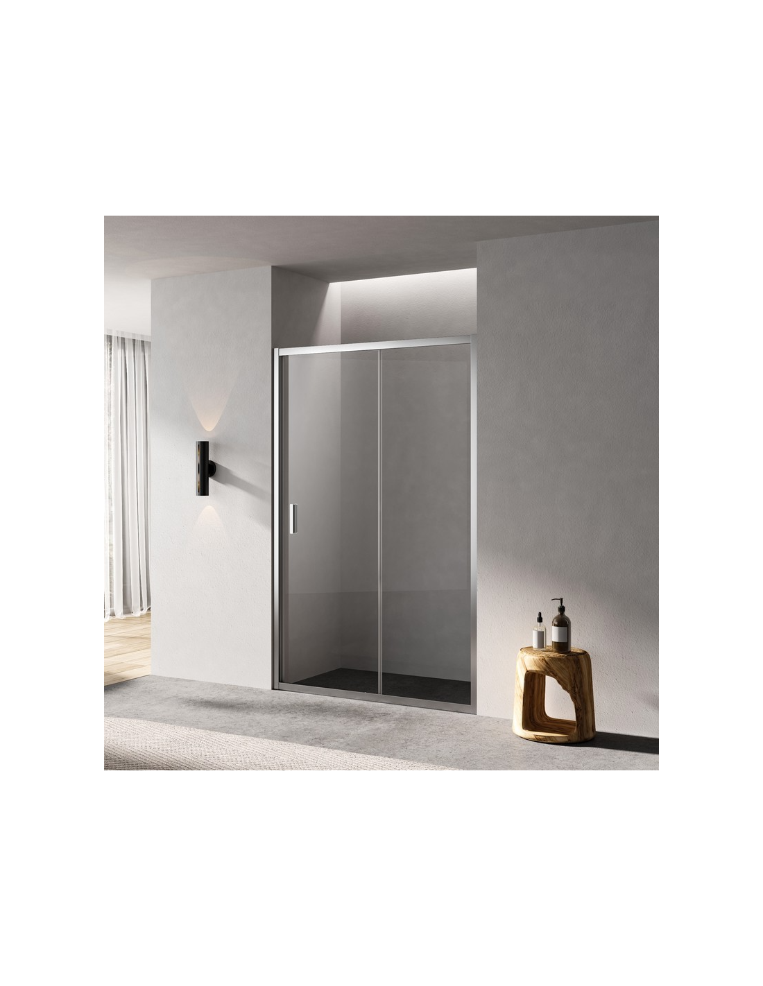 La porta doccia è dotata di 2 pareti in vetro di 6 mm di spessore con accesso a destra o a sinistra (un pannello in vetro fisso e un porta scorrevole in vetro con manico in ABS). La porta è dotata di un blocco magnetico, che garantisce una chiusura impermeabile. I profili sono in alluminio opaco.